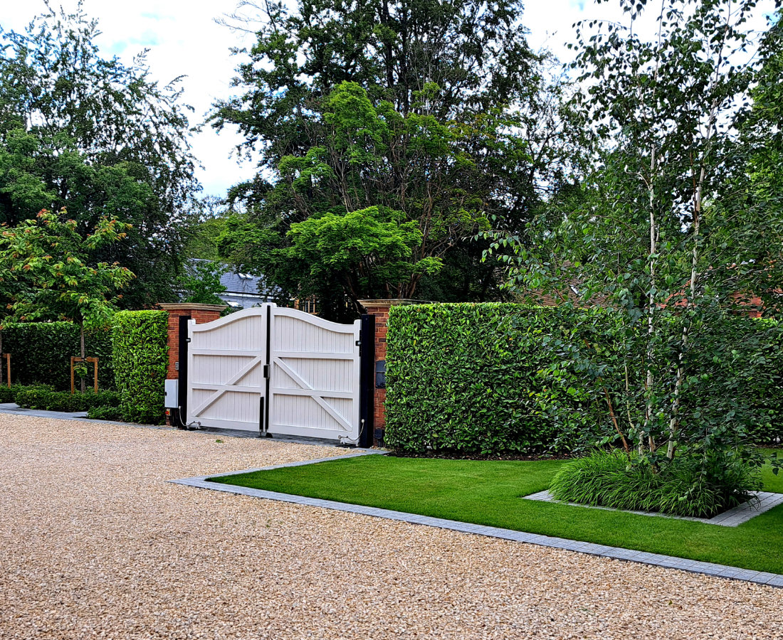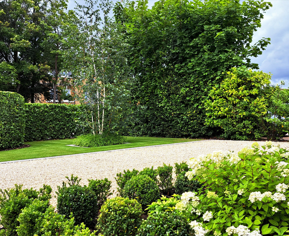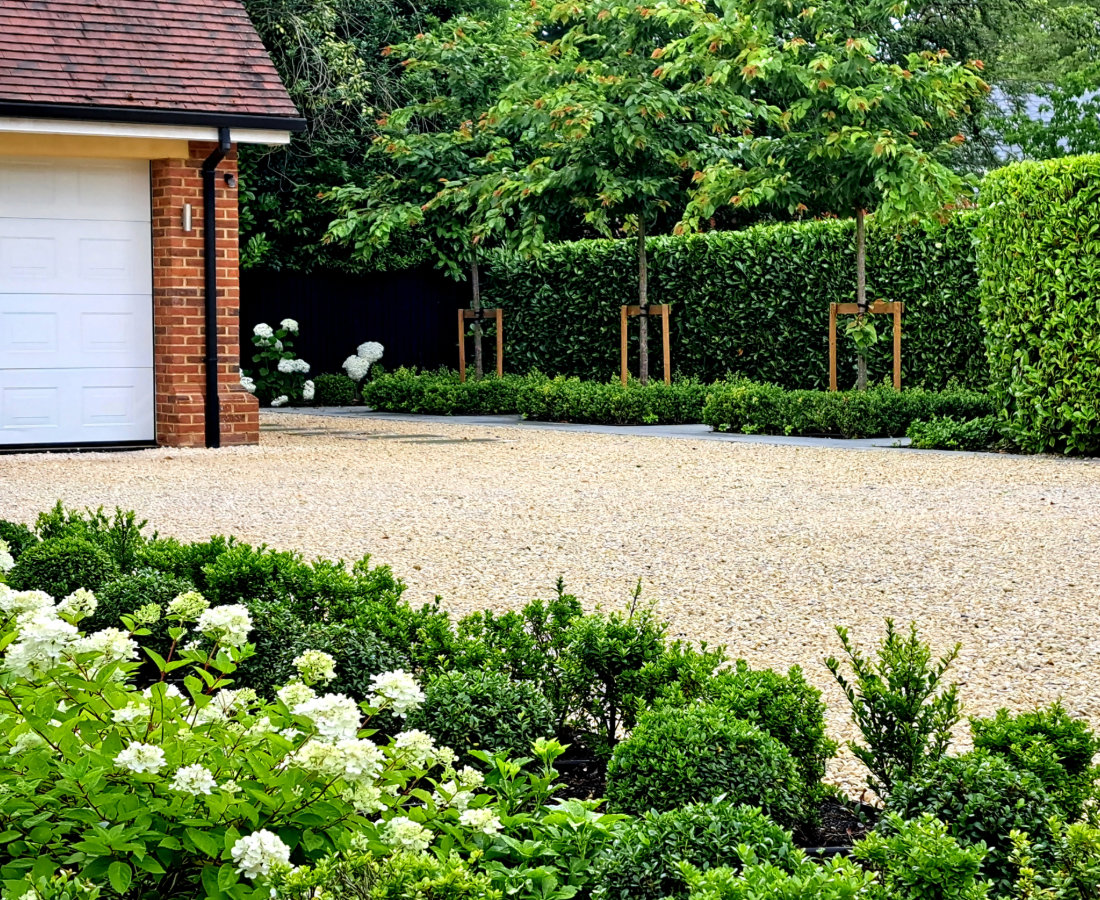 The brief for this large front garden was to balance structure with softness, creating a cohesive look to complement the architecture of the house, and add a touch of style to the driveway. A key requirement was to completely remove an existing resin bound driveway that was in poor repair, and rethink the planting to create a low-maintenance/high impact scheme with strong vertical accents and a long season of interest. A slope leading up to the front door was not liked and the decision was taken to remove it in favour of a statement step in keeping with the proportions of the porch. The overall style is classical-contemporary with a touch of ‘understated elegance’.