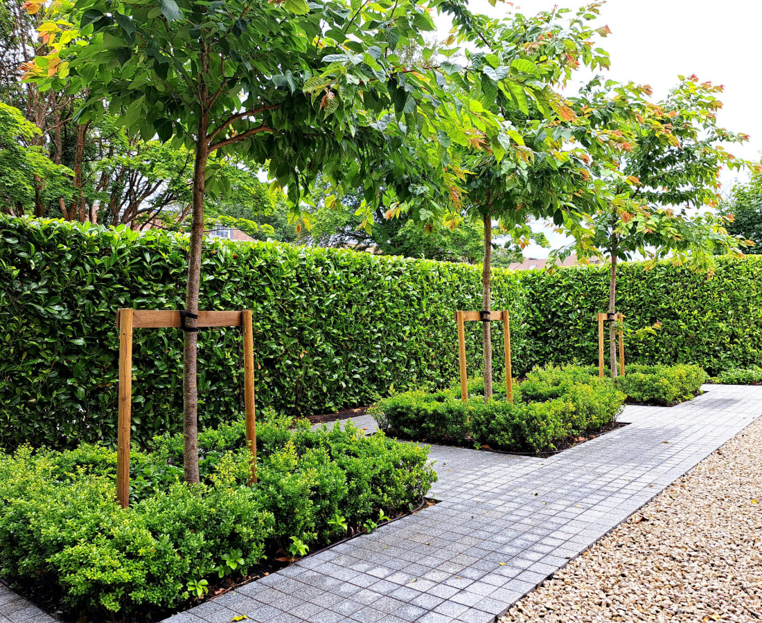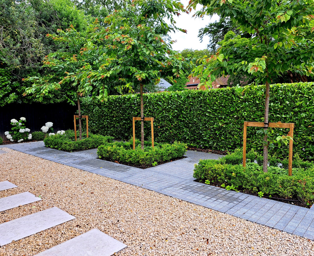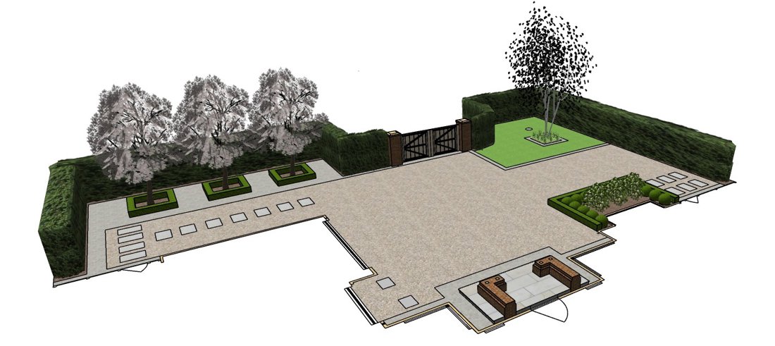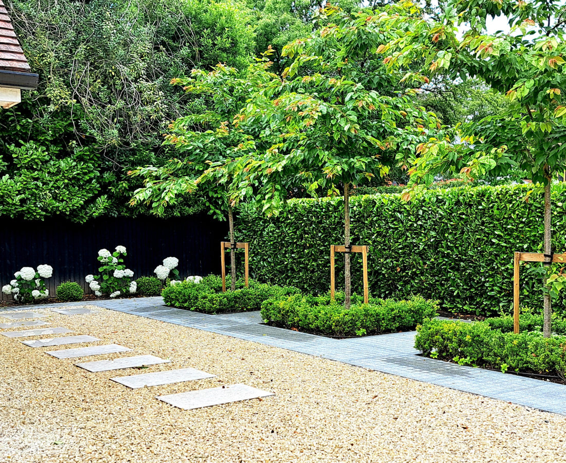 The brief for this large front garden was to balance structure with softness, creating a cohesive look to complement the architecture of the house, and add a touch of style to the driveway. A key requirement was to completely remove an existing resin bound driveway that was in poor repair, and rethink the planting to create a low-maintenance/high impact scheme with strong vertical accents and a long season of interest. A slope leading up to the front door was not liked and the decision was taken to remove it in favour of a statement step in keeping with the proportions of the porch. The overall style is classical-contemporary with a touch of ‘understated elegance’.