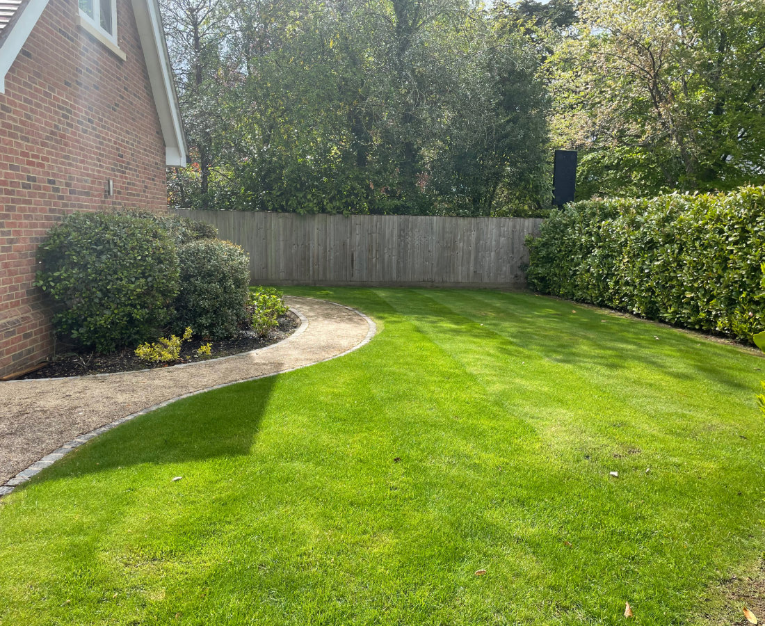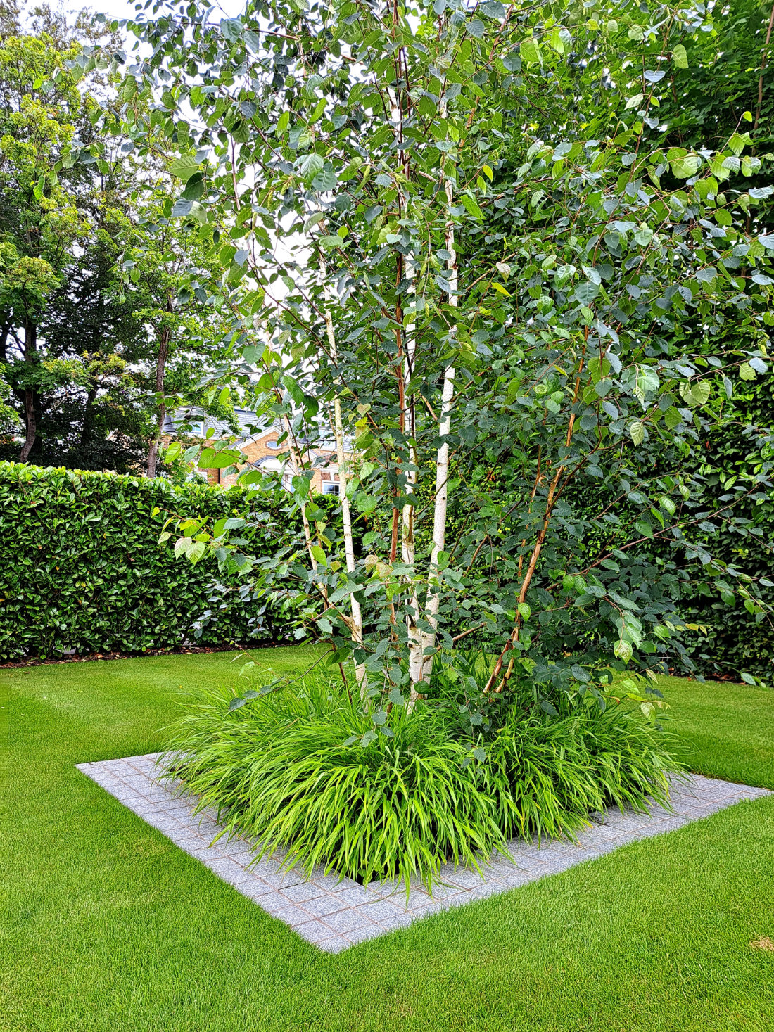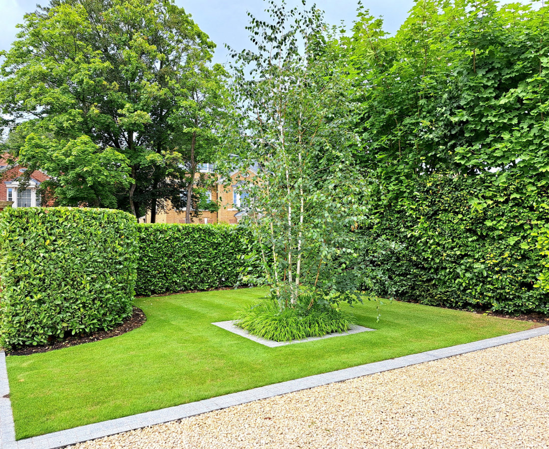 The overall result is a pared-back, elegant scheme that combines ample space for off-street parking with layered, soft landscaping featuring ornamental cherry trees, shrubs, dwarf evergreen hedging and herbaceous perennials. A specimen, multi-stem Silver Birch, underplanted with a carpet of Japanese grasses, creates a minimalist focal point in the lawn. Subtle garden lighting was used to accent the new doorstep, and illuminate the specimen trees and planted borders after dark.