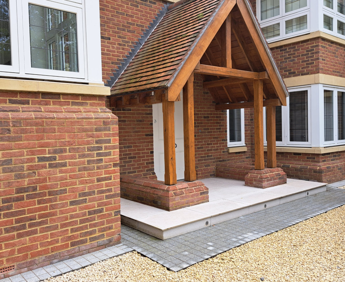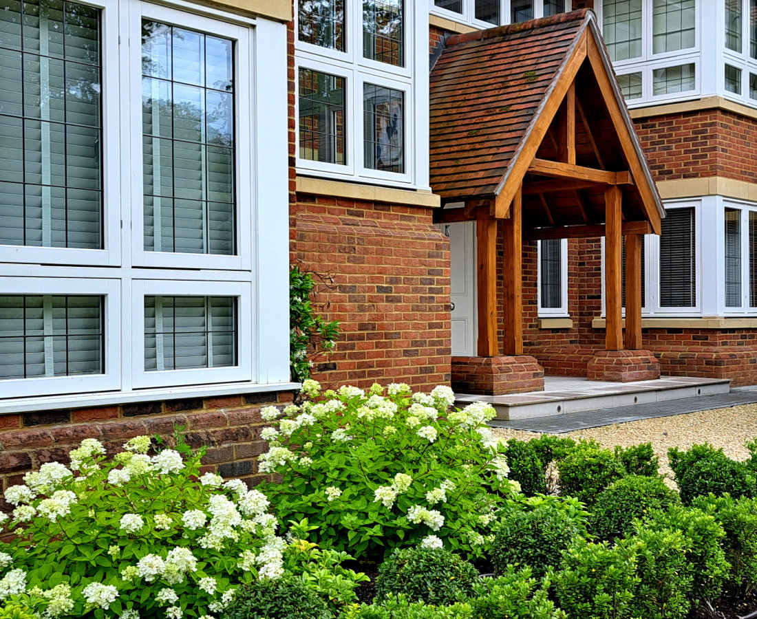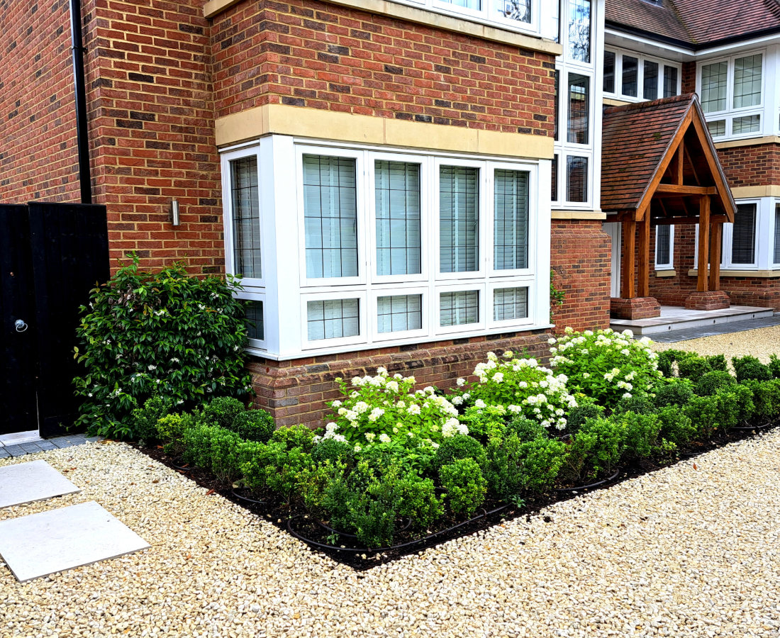 While some lawn was removed to make way for more parking, an area of lawn was retained to ensure an appropriate amount of green space to the driveway. Hard landscaping materials were chosen to harmonise with the façade of the house. Granite setts were used to create clean lines, accentuate planted areas and provide a retaining edge to borders. Cotswold stone chippings replaced the former resin driveway with a series of stepping stones adding interest. A new, wide and deep statement doorstep, created using large format porcelain paving, enhances the entrance and creates a welcoming threshold.